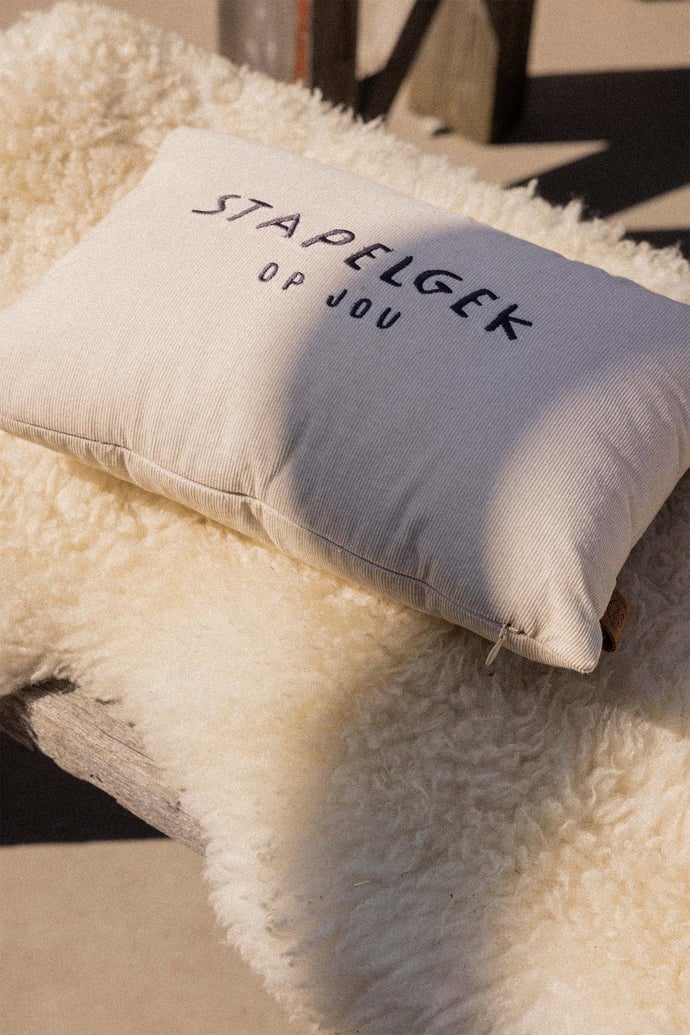 Het Zusss kussen corduroy stapelgek is een sfeervolle toevoeging aan je woonkamer. Dit kussen corduroy voelt heerlijk zacht aan dankzij de ribstof en heeft een fijne maat van 35x25 cm. Met de speelse tekst 'stapelgek op jou' krijgt je interieur een warme, persoonlijke touch. Het kussen corduroy is uitgevoerd in een natuurlijke zandkleur met een subtiele antracietgrijze print, perfect om te combineren met andere woonaccessoires. Dit kussen corduroy maakt jouw zithoek extra gezellig en uniek.