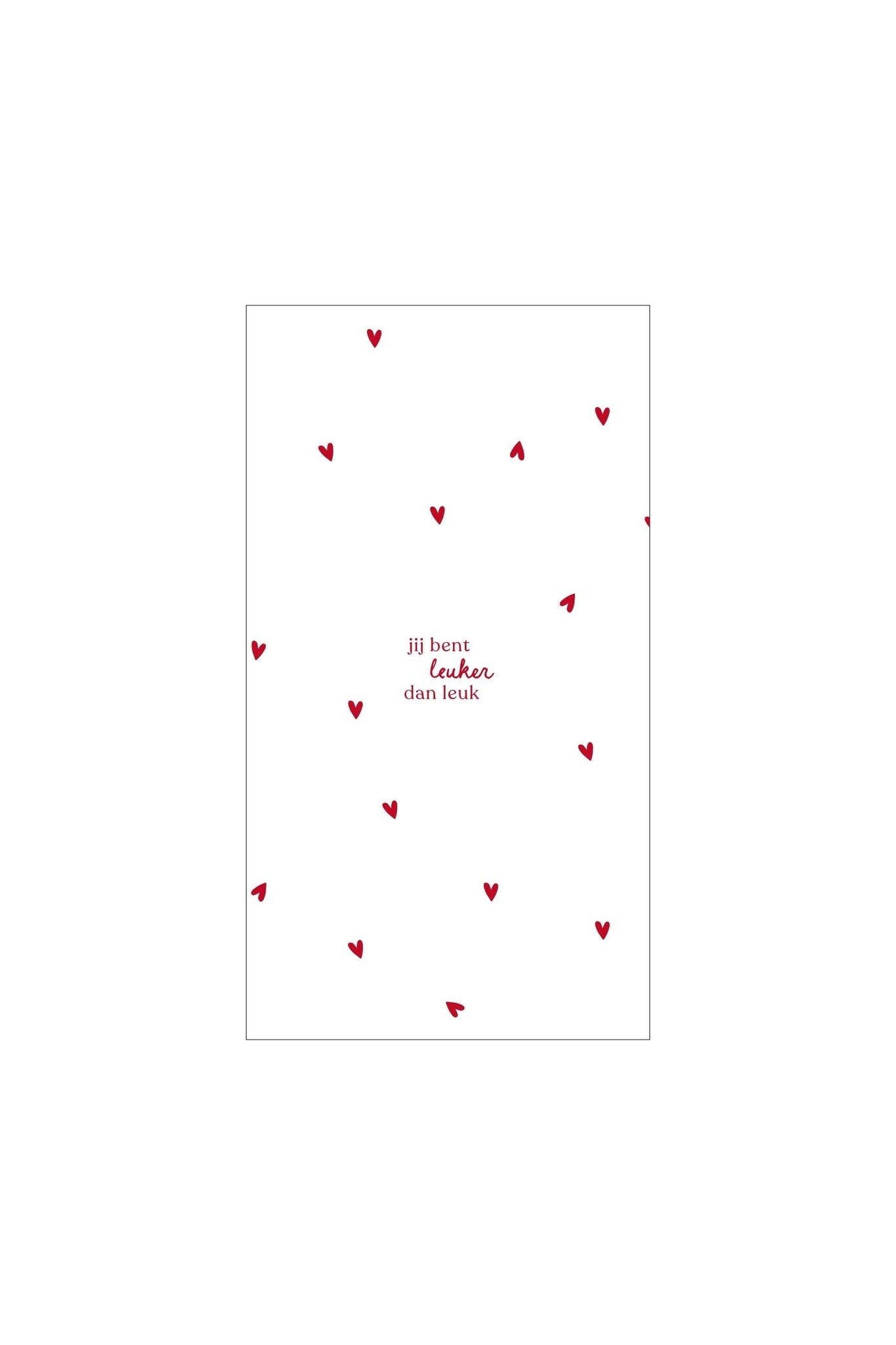 Servetten leuker dan leuk! Met hun schattige hartjes en de tekst "jij bent leuker dan leuk", brengen ze een glimlach op ieders gezicht. Deze witte en rode servetten van 11x20 cm zijn ideaal voor feestjes of een gezellige lunch. Ze zijn niet alleen praktisch, maar ook een ware eyecatcher! Perfect voor als je net dat beetje extra wilt geven aan je tafelsetting. Laat je creativiteit de vrije loop en maak elke maaltijd bijzonder!