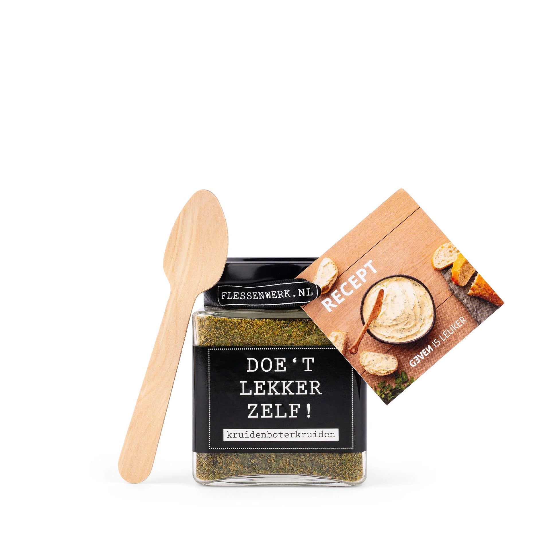 Dit potje vol smaak zit boordevol kruiden die je eenvoudig kunt mengen met boter of olie. Of je nu een smeuïge kruidenboter wilt maken voor bij het stokbrood of een aromatische kruidenolie voor over je salade, het kan allemaal. En met de bijgeleverde bamboe lepel wordt het mixen een stuk makkelijker. Het etiket zegt het al: 'Doe 't lekker zelf!'—en dat is precies wat je gaat doen.